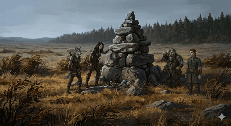 As the adventurers crossed the plains south of the river, the wind began to whip through the low shrubs and defiant wildflowers. It was there, standing lonely against the sweeping grass, that they found it: a Cairn.