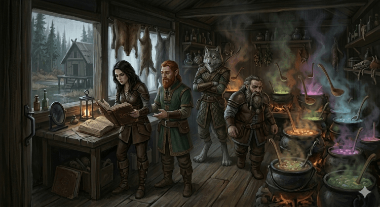 Inside, the air was thick with arcane heat. Lucia and Rudever, the resident experts on the strange, began to poke around with sticks, careful not to touch the bubbling mixtures directly. The potions were clearly transformative—infused with animal parts and raw magic.