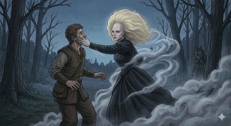 At the edge of the woods, she spotted Anselm, the trader, meeting with a woman of startling, otherworldly beauty—pale skin, dark robes, and a halo of blonde hair. The air between them was thick with tension.