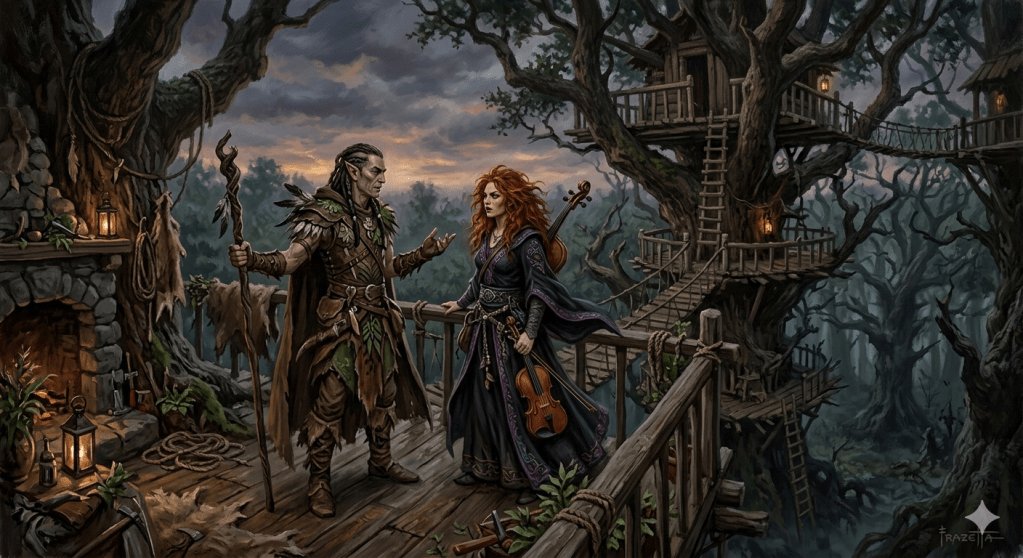With a sudden rush of feathers and a sharp cry, Rudever took flight, a heavy coil of hempen rope clutched in his talons. He banked toward the high platform of the treehouse, the party’s gear shrinking and merging into the transformation—a bit of magic Lucia found “adorable,” despite the predatory grace of the bird.