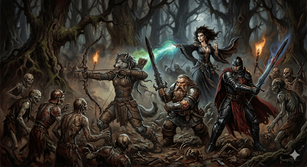 As they trekked toward the northern route, the atmosphere shifted from whimsical to lethal. The woods grew silent—too silent. Then came the dragging footsteps and the dry, rattling breath of the Restless Dead.