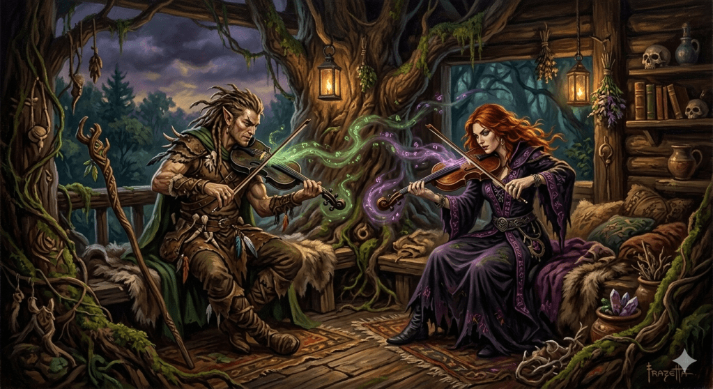 After the bargain was struck the pair played for hours. The powerful witch having the half-elf practice with a variety of instruments, vocals, and musical theory. The combination gave Rudever arcane insight that he had never considered possible before. As the sun dipped below the horizon, he felt a new power thrumming in his bones.